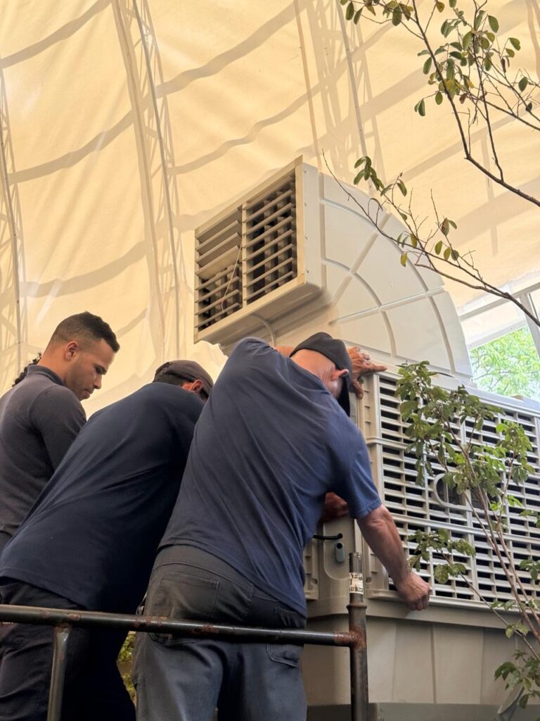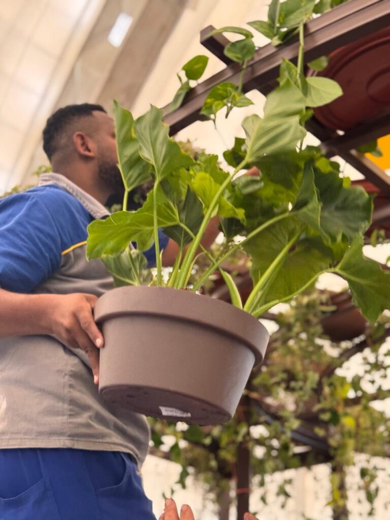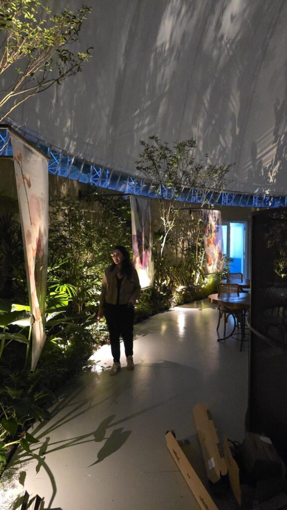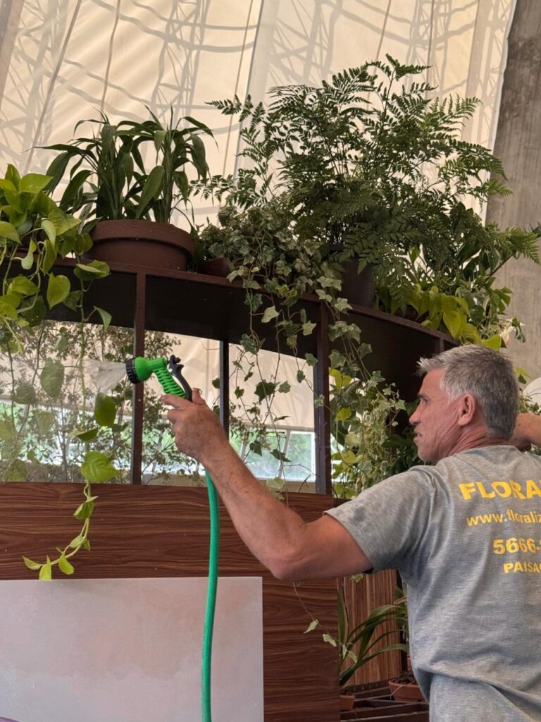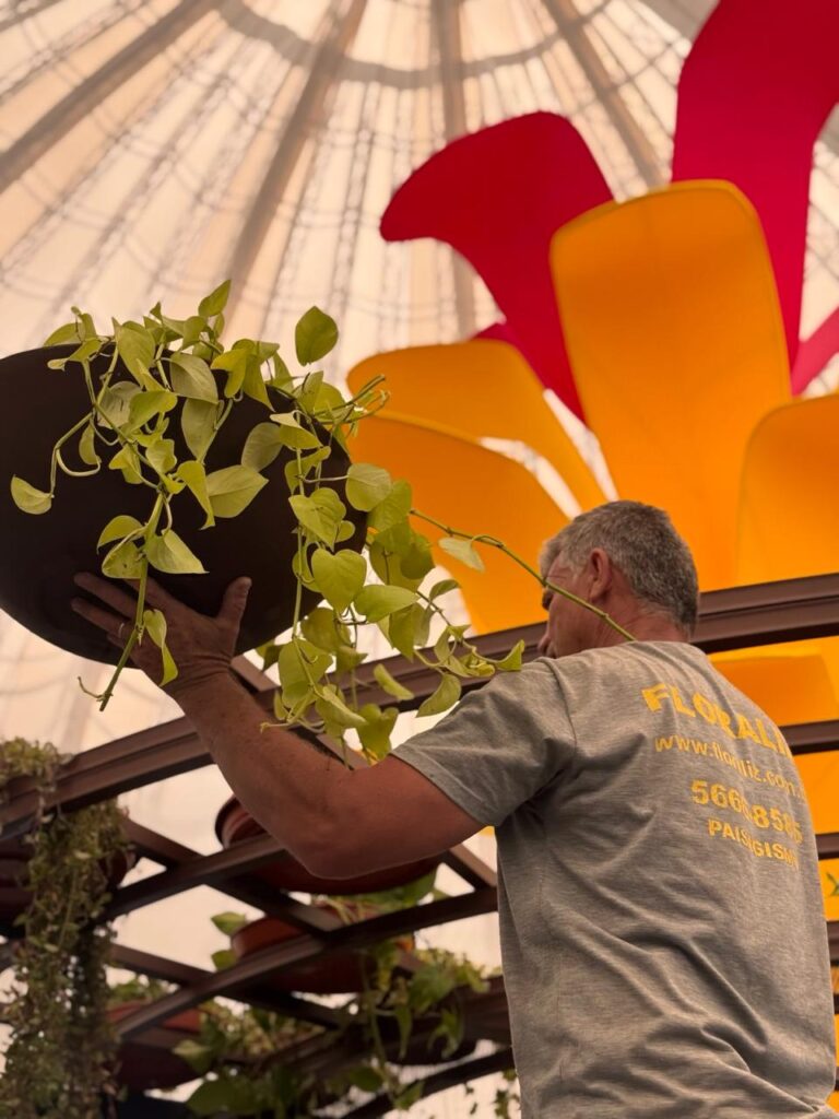 Na sequência, foram instalados os vasos superiores, estruturas de exposição e vegetações pendentes, criando uma experiência mais imersiva para o visitante.
