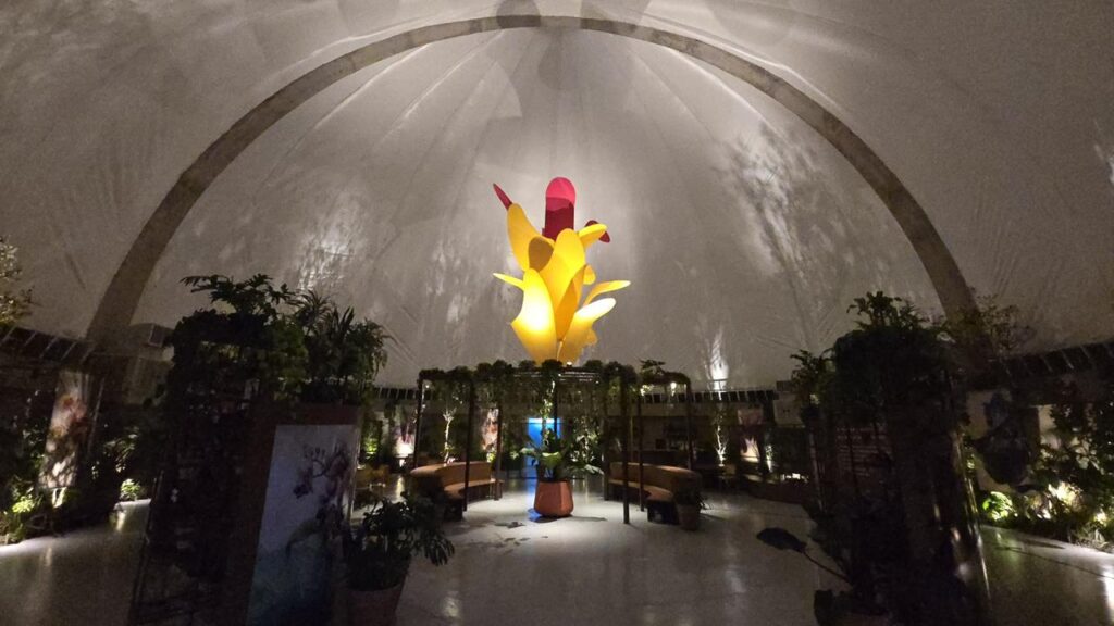 Durante o dia, o visitante percebe a diversidade das espécies e a riqueza do paisagismo. À noite, a luz transforma o espaço e cria um novo jardim visual.